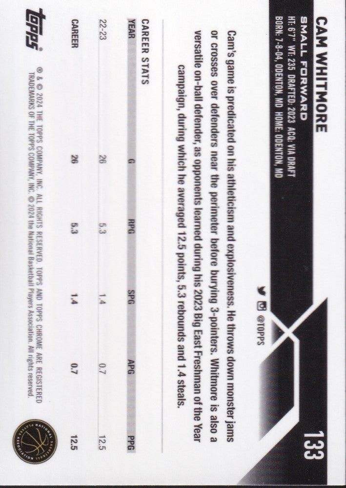 2023-24 Topps Chrome Basketball (NBA) #133 Cam Whitmore Base (RC) Rookie Card