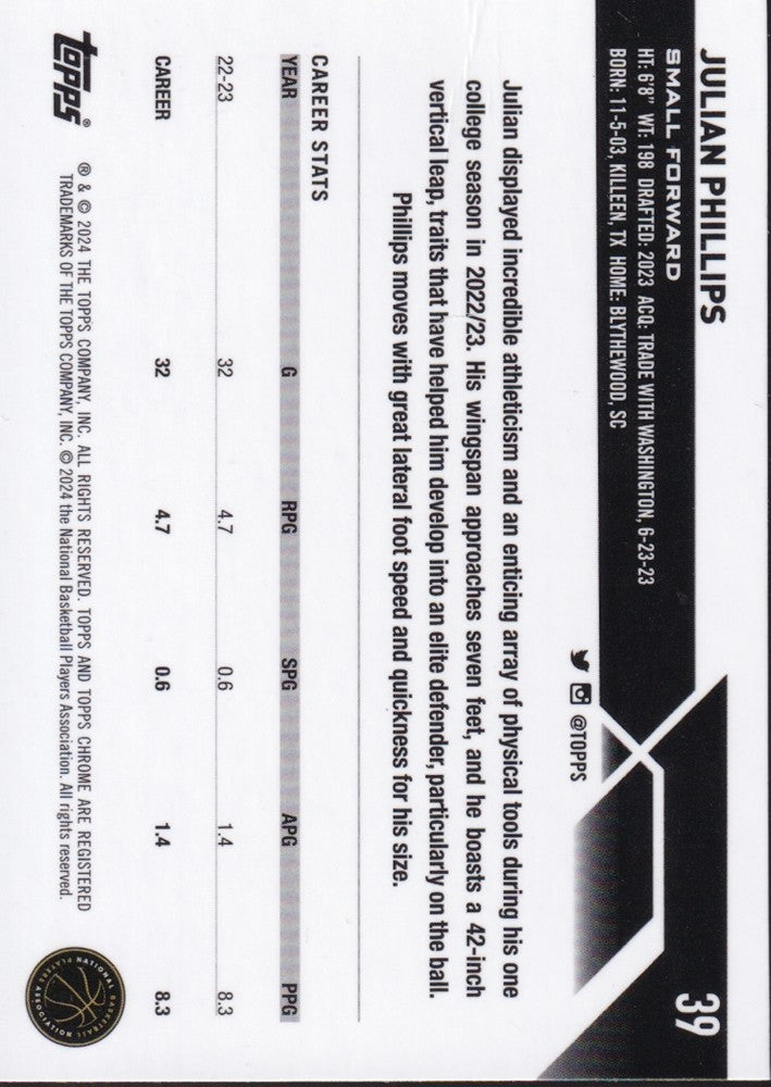 2023-24 Topps Chrome Basketball (NBA) #39 Julian Phillips Base (RC) Rookie Card