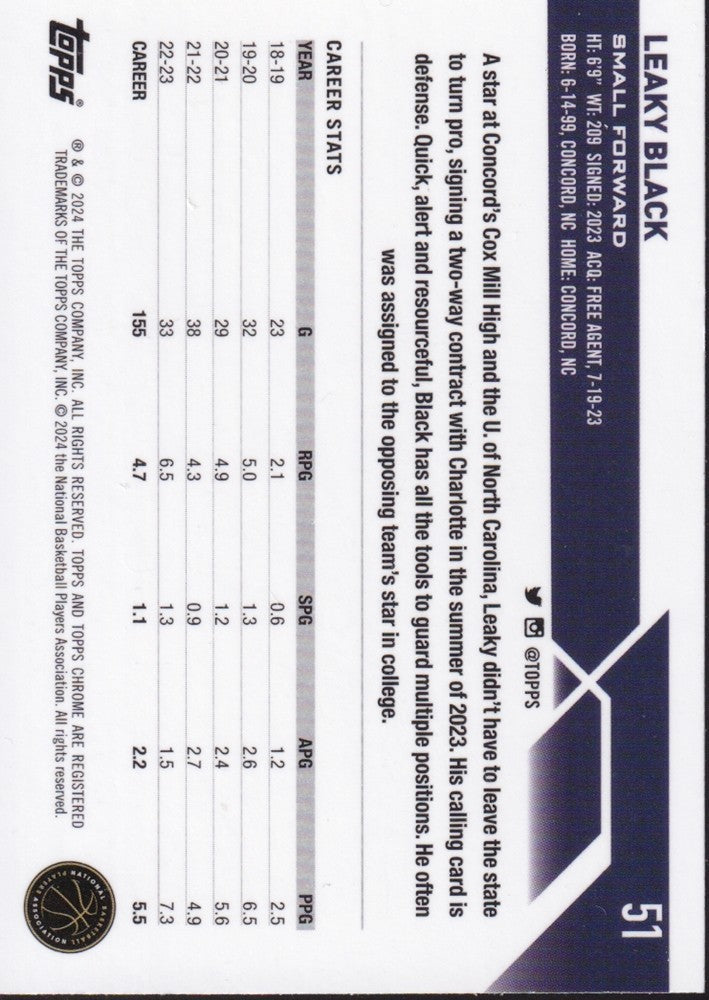 2023-24 Topps Chrome Basketball (NBA) #51-Leaky Black Base (RC) Rookie Card