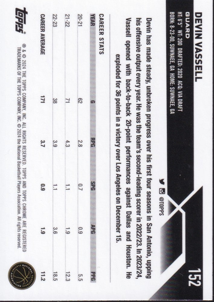 2023-24 Topps Chrome (NBA) Blue Basketball Refractors Card-#152 Devin Vassell