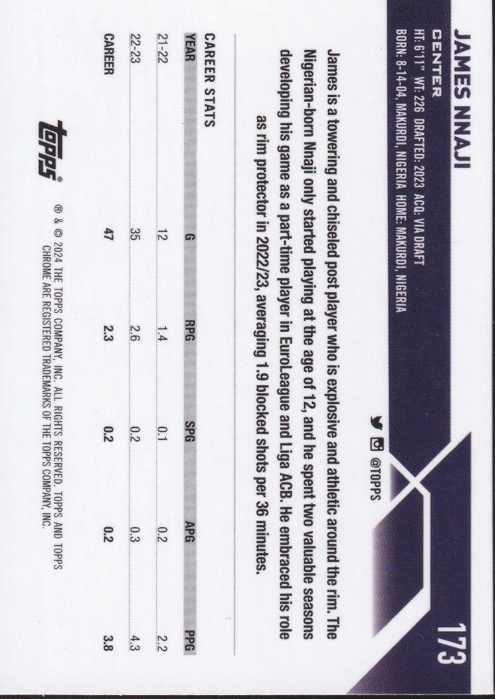 James Nnaji #173 Base (RC) Rookie Card-2023/24 Topps Chrome Basketball (NBA)